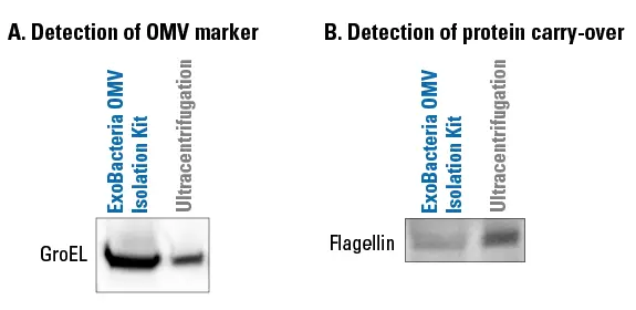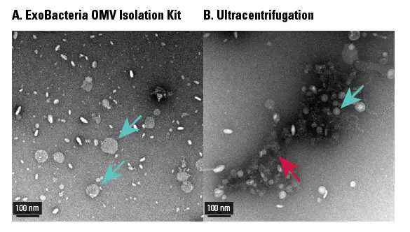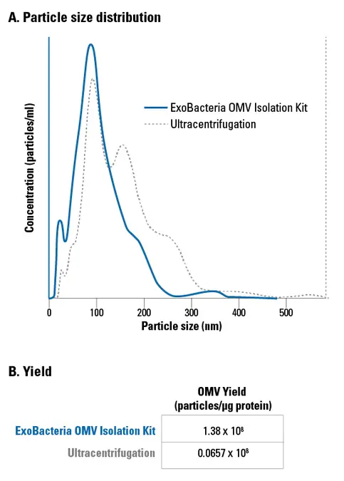 Figure 1. ExoBacteria OMV Isolation Kit produces uniform OMVs with reduced protein contamination compared to ultracentrifugation.