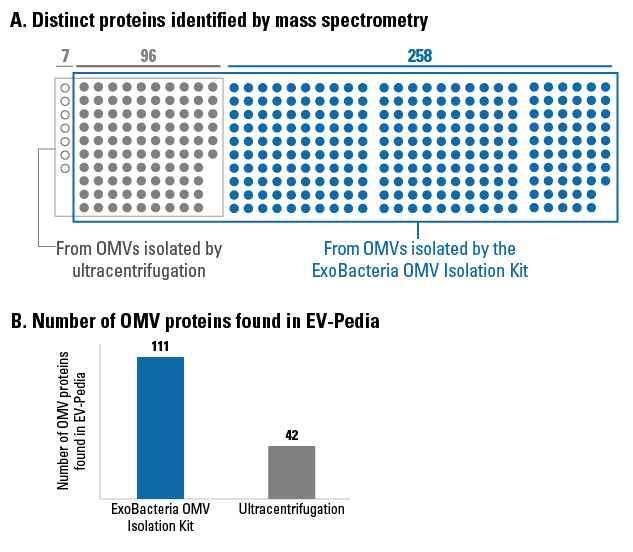 (B) A higher proportion of proteins identified from ExoBacteria OMV Isolation Kit–derived OMVs matched entries in the EV-Proteome / EV-Pedia database, further demonstrating the increased specificity and biological relevance of OMVs isolated using the ExoBacteria OMV Isolation Kit compared to ultracentrifugation.